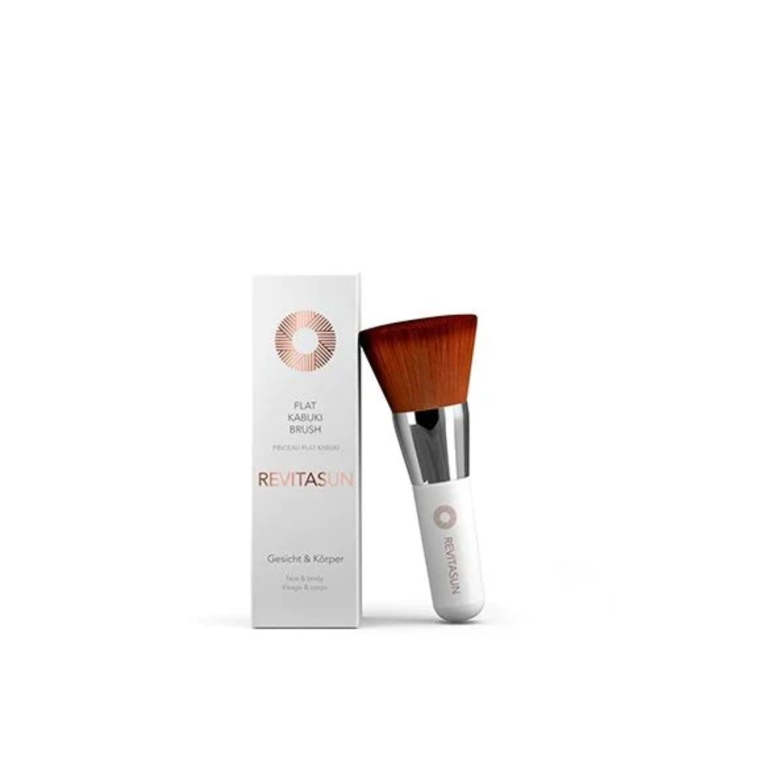 REVITASUN Kabuki šepetėlis turi trumpus, kompaktiškus šerius ir lygią šepetėlio galvutę. Ši forma idealiai tinka mažesnėms odos vietoms, tokioms kaip veidas, dekoltė, rankos ar pėdos, ir puikiai prisitaiko prie jų kontūrų.